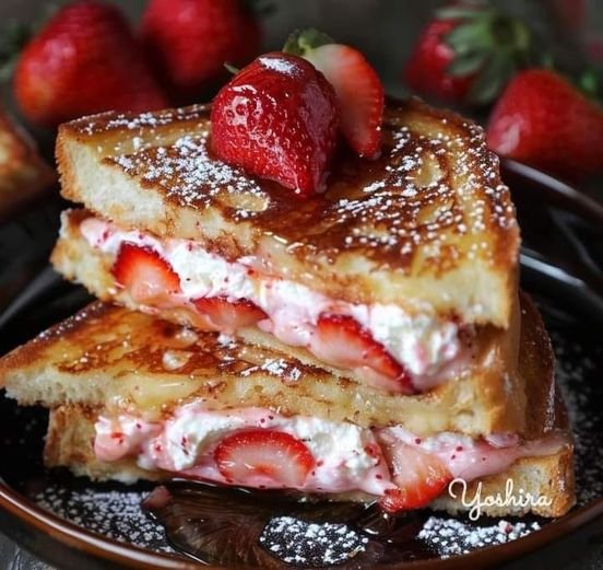 Top with the strawberries. Optionally, dust with powdered sugar or drizzle with syrup.