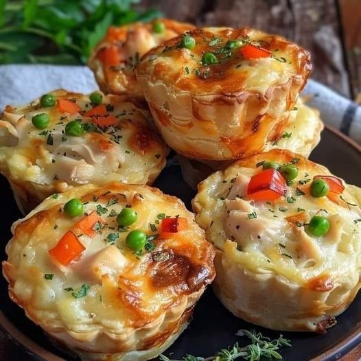 Cut puff pastry into squares large enough to fit into the muffin cups. Press pastry squares into the tin, leaving an overhang.