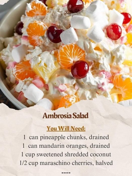 A classic, creamy Ambrosia salad with juicy fruits, fluffy marshmallows, and a light, sweet dressing. Perfect for gatherings, this refreshing dish balances flavors and textures, making it a festive dessert or side for any occasion.