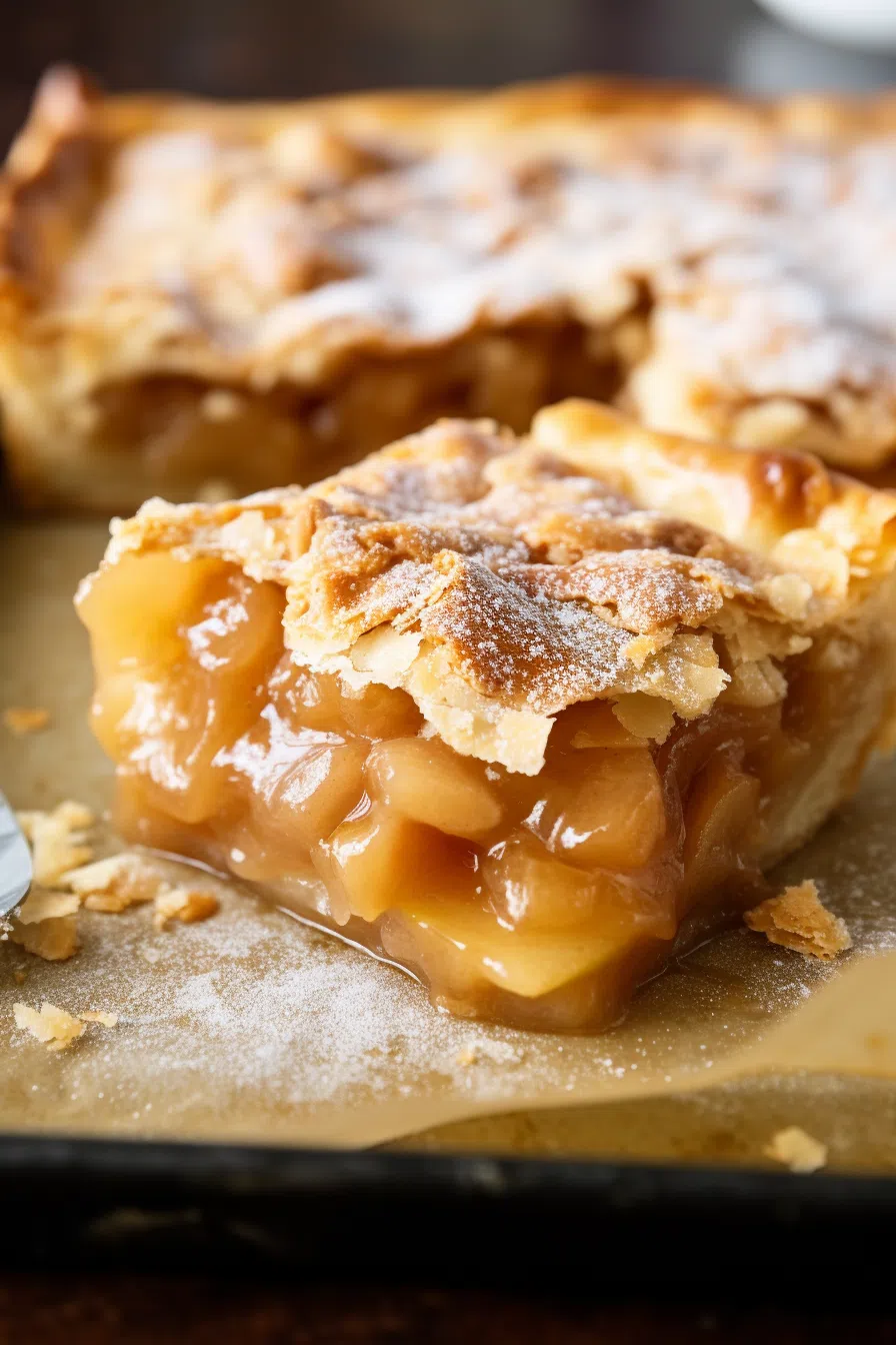 Pie Assembly: Activate the oven’s preheating function, setting it to 375° F (190° C). Prepare a 10×15×1-inch baking tray by lining its base with parchment paper. If the tray dimensions slightly vary, proceed without concern, although there might be residual dough. Roll out the larger dough portion on a surface lightly dusted with flour, aiming for a 18×13-inch rectangle. Gently position this over the tray, allowing the dough’s edges to drape over the sides. Temporarily place the tray in a refrigerator. Concurrently, roll out the second dough portion into a 16×11-inch rectangle. Retrieve the tray and evenly spread the apple mixture, ensuring the inclusion of the juices. Layer with the second dough portion and trim the excess. Firmly seal the edges of the dough. Conclude by brushing the surface with either heavy cream or the egg-water blend. Incise several 1-inch slits on the dough’s surface to facilitate steam release.