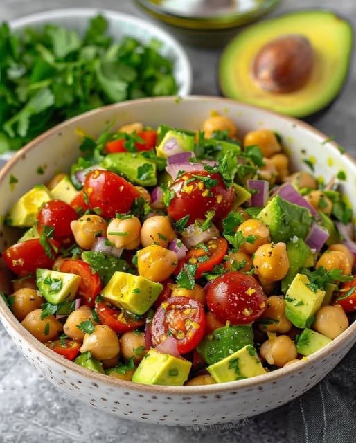 A bright Mediterranean-style salad made with creamy avocado, protein-rich chickpeas, crisp veggies, and a lemon-olive oil dressing. Naturally anti-inflammatory, filling, and ready in minutes.