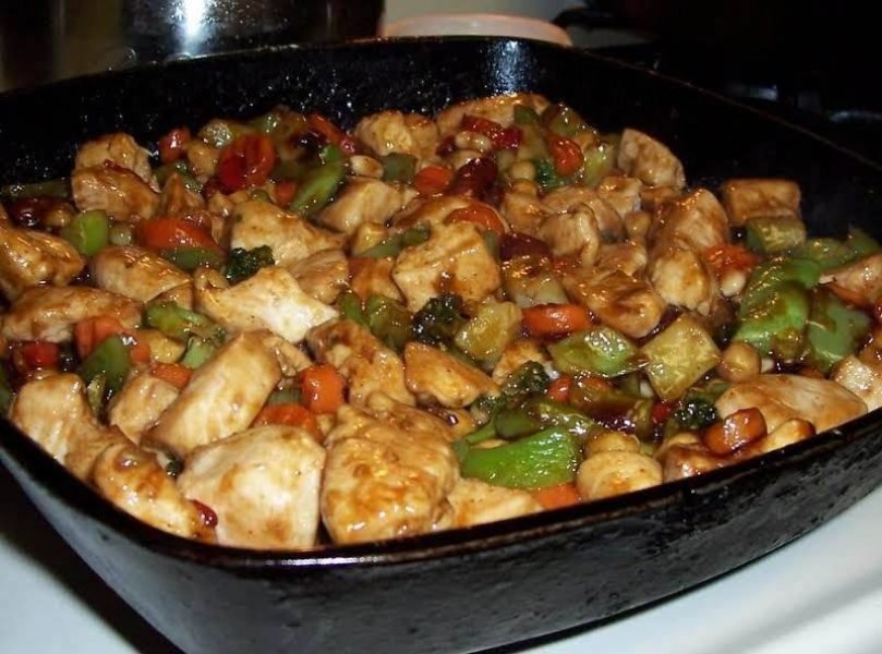 7. Return chicken to pan with vegetables, add sauce and stir.