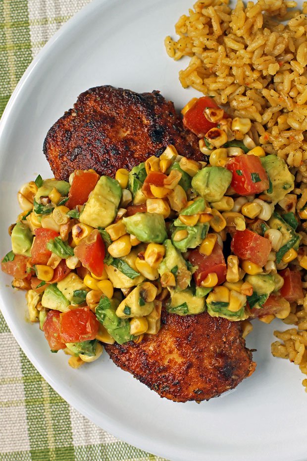 Serve each seasoned chicken breast with a ¾ cup of the avocado corn topping piled on top.