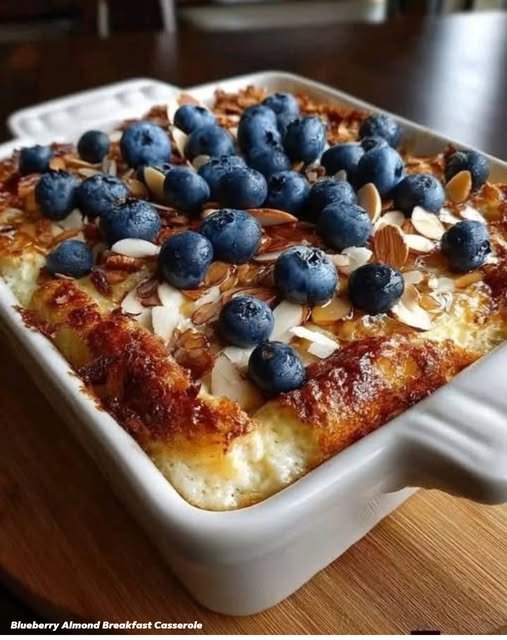 This recipe is for a baked breakfast dish that combines bread, blueberries, and almonds in a custard base. It is a make-ahead recipe often prepared the night before and baked in the morning. The dish is categorized as a breakfast or brunch item and features techniques such as soaking and baking to achieve a texture that is both creamy and structured.