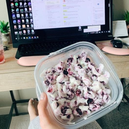 Mix honey and yogurt. Stir in blueberries and almonds. Place them in a tray to freeze. Freeze 2 hours for solid results. 18-25 frozen protein bites.