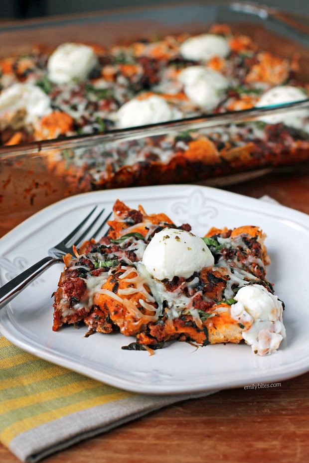 Stir in the tomato sauce, pasta sauce, spinach, salt, Italian seasoning, pepper flakes, pepper and biscuit dough pieces until well combined. Transfer the mixture to the prepared baking dish and spread evenly. Bake for 25 minutes. Remove from oven and sprinkle the Mozzarella over the top. Drop spoonfulls of the ricotta across the surface of the casserole and then sprinkle with a bit more Italian seasoning. Return to the oven for another 15 minutes until hot and bubbly. Top with additional sliced basil if desired.