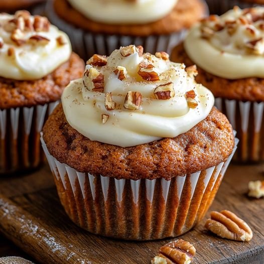 Glaze and garnish: Once the muffins are cool, top them with the cream cheese glaze. Garnish with chopped pecans for extra crunch and flavor.