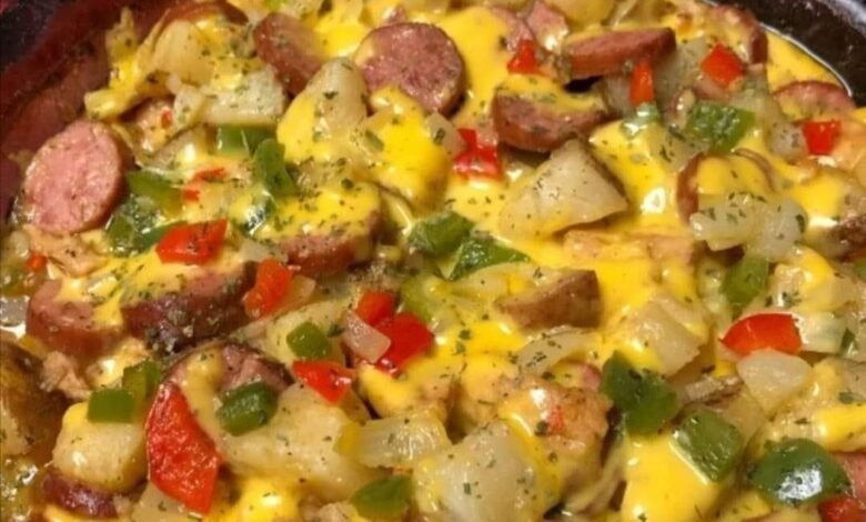 Pour white/cheese sauce over potatoes and meat. Sprinkle shredded sharp cheddar cheese on top, and then sprinkle paprika evenly over the top.