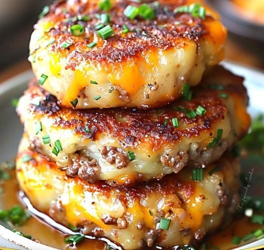 Place a spoonful of the beef mixture on a potato patty, top with shredded cheese, and cover with another patty, sealing the edges.