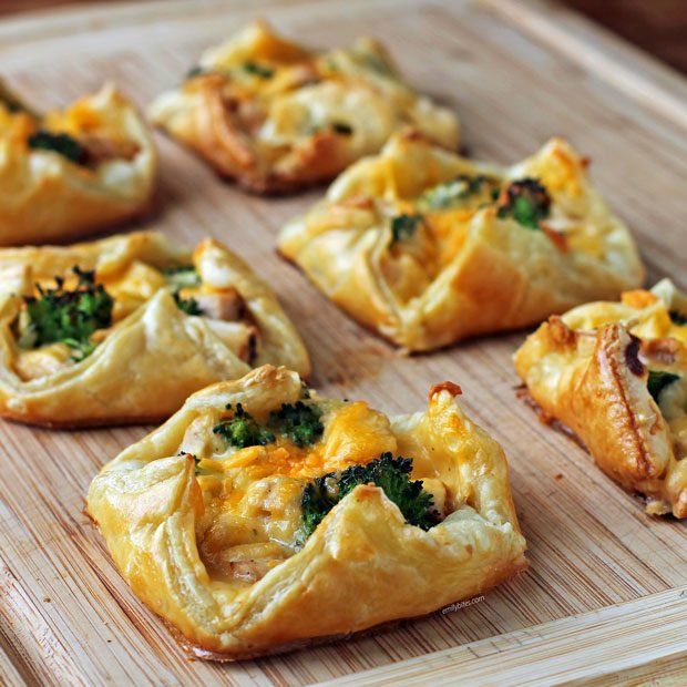These Cheesy Chicken and Broccoli Pastry Bundles are flaky pastry, chicken and broccoli smothered in a creamy cheddar cheese sauce!