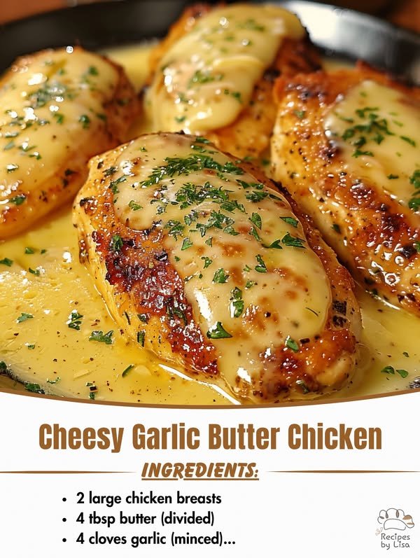 Cheesy Garlic Butter Chicken is a rich and comforting dish featuring juicy chicken seared in a garlicky butter sauce and topped with melty mozzarella and Parmesan. This easy one-pan recipe comes together in under 30 minutes, making it perfect for busy weeknights or cozy family dinners. Serve it over pasta, rice, or veggies for a meal that’s packed with flavor and pure comfort!