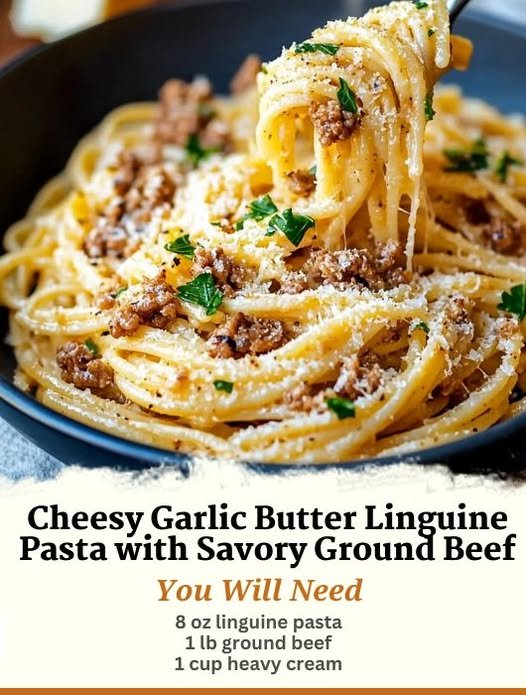 Cheesy Garlic Butter Linguine Pasta with Savory Ground Beef