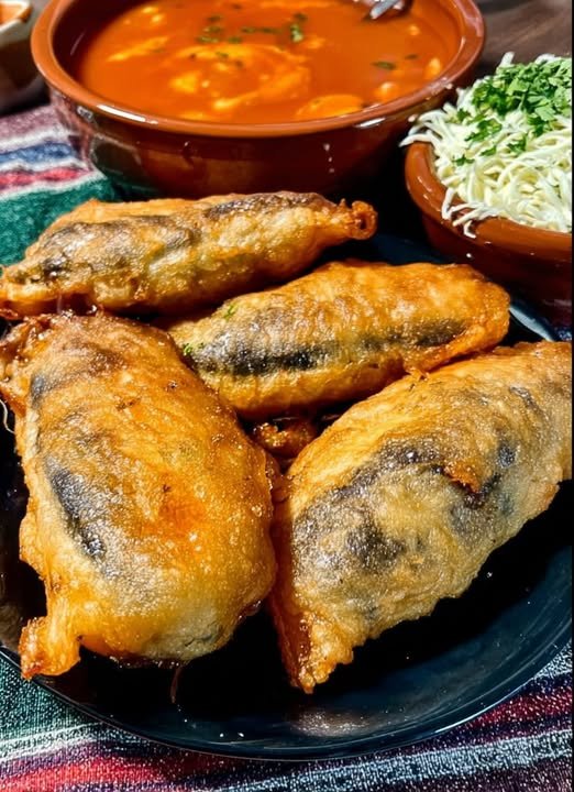 • In a large casserole, heat about 1/2-inch of oil over medium to medium-high heat. Once hot, test the oil, by dipping a teaspoon of batter into the oil; if there are active bubbles all around it, it’s ready. Dip each of the stuffed and floured chiles into the egg batter, making sure that they are entirely covered in batter.