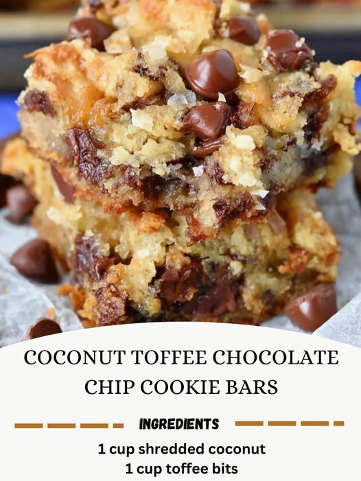 9. Enjoy these irresistible Coconut Toffee Chocolate Chip Cookie Bars as a sweet treat for any occasion!