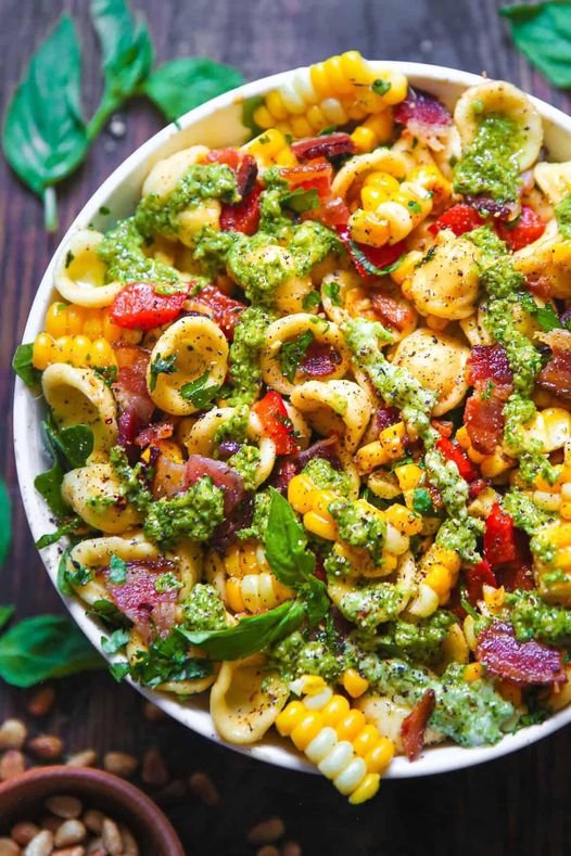 Corn Pasta Salad with Bacon and Creamy Pesto Dressing