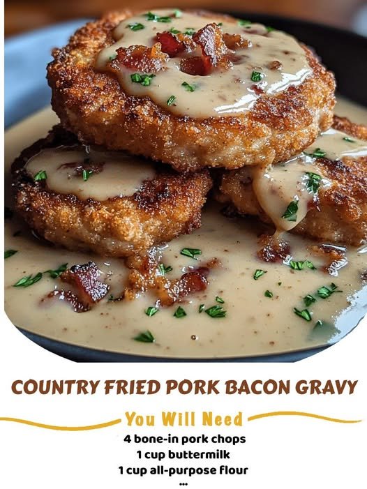 Golden fried pork chops marinated in buttermilk, served with rich and creamy bacon gravy for the ultimate Southern comfort meal.