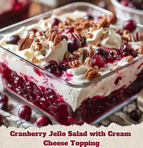 1. Spread Topping: Once the cranberry layer is fully set, spread the cream cheese topping evenly over the jello.