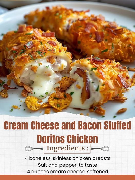 Dip each stuffed chicken breast into the beaten eggs, then coat with crushed Doritos chips, pressing gently to adhere.