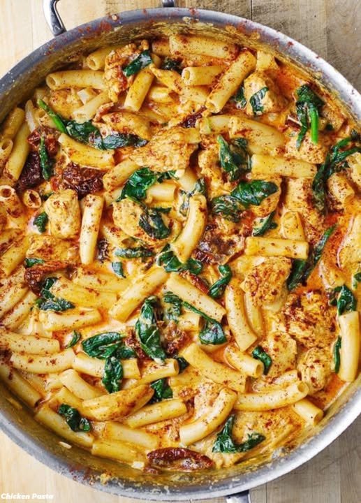 Creamy Asiago Chicken Pasta with Sun-Dried Tomatoes, Spinach, Garlic, and Paprika.