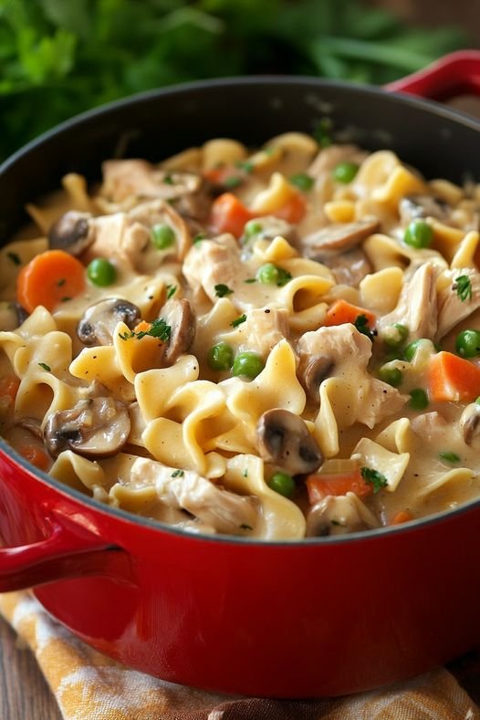 Indulge in the comforting blend of Creamy Chicken Pot Pie Noodles, featuring tender chicken, creamy gravy, carrots, peas, and al dente egg noodles. This heartwarming dish is perfect for a cozy dinner at home.