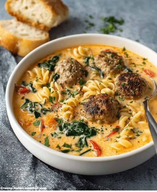 ๐ฒ Creamy Italian Meatball Soup A hearty, comforting soup filled with tender meatballs, vegetables, pasta, and a creamy Italian-style broth. Perfect for a cozy dinner and great with crusty bread. ๐ฎ๐น ๐ Time Prep Time: 15 minutes Cook Time: 30 minutes Total Time: 45 minutes Servings: 4โ6 ๐งพ Ingredients For the Meatballs 1 lb (450 g) ground beef or Italian sausage ยผ cup breadcrumbs ยผ cup grated Parmesan cheese 1 egg 2 cloves garlic, minced 1 tbsp chopped parsley ยฝ tsp salt ยฝ tsp black pepper ยฝ tsp Italian seasoning For the Soup 1 tbsp olive oil 1 small onion, diced 2 cloves garlic, minced 2 carrots, diced 2 celery stalks, diced 6 cups chicken broth 1 cup small pasta (ditalini or small shells) 1 tsp Italian seasoning ยฝ tsp salt (adjust to taste) ยฝ tsp black pepper 1 cup heavy cream 2 cups fresh spinach ยฝ cup grated Parmesan cheese ๐ฉโ๐ณ Instructions 1. Make the Meatballs In a bowl, combine ground beef, breadcrumbs, Parmesan, egg, garlic, parsley, salt, pepper, and Italian seasoning. Mix gently and roll into small meatballs (about 1 inch). 2. Brown the Meatballs Heat olive oil in a large pot over medium heat. Brown meatballs for 4โ5 minutes, turning occasionally. Remove and set aside (they will finish cooking in the soup). 3. Cook the Vegetables In the same pot, sautรฉ onion, carrots, and celery for 5 minutes until softened. Add garlic and cook 1 minute. 4. Build the Soup Pour in chicken broth and add Italian seasoning. Bring to a gentle boil. 5. Add Pasta & Meatballs Add pasta and browned meatballs. Simmer 10โ12 minutes until pasta is tender and meatballs are cooked through. 6. Make It Creamy Reduce heat to low. Stir in heavy cream, spinach, and Parmesan cheese. Cook 2โ3 minutes until spinach wilts. 7. Serve Taste and adjust salt and pepper. Serve hot with extra Parmesan on top. ๐ฝ๏ธ Serving Suggestions Garlic bread Crusty artisan bread Simple green salad ๐ก Tips โ Use Italian sausage instead of beef for extra flavor. โ Add potatoes instead of pasta for a heartier soup. โ Stir in ยฝ cup cream cheese for an extra rich broth.