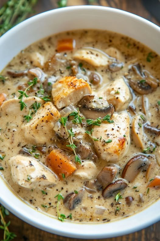 Remove the cooked chicken, shred it, and return it to the pot. Stir in the heavy cream and cooked wild rice.