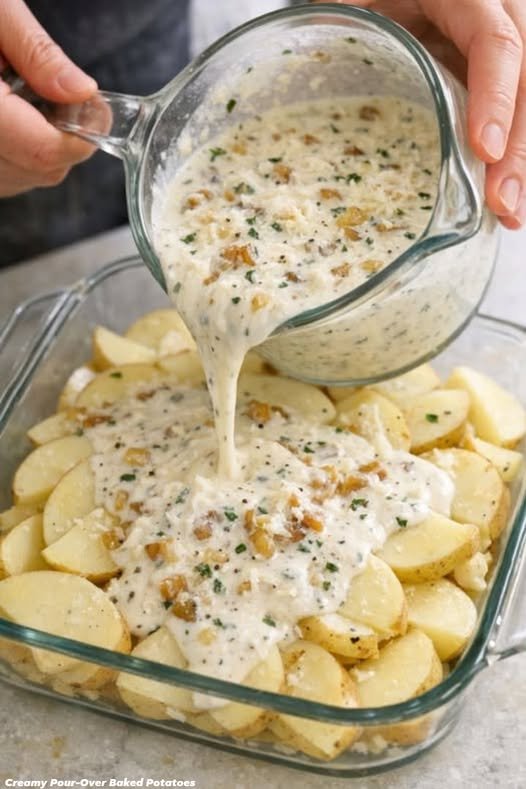 Pour the creamy mixture over the potatoes: Give the creamy pour-over a quick stir, then slowly pour this one creamy mixture all over the raw potatoes in the glass casserole dish, making sure to distribute the onions and herbs as evenly as you can. Gently shake the dish or use a spoon to nudge the potatoes so the cream seeps down between the slices.
