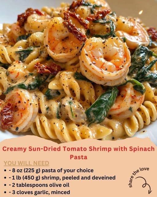 – Creamy Sun-Dried Tomato Shrimp with Spinach Pasta