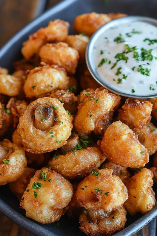 Indulge in these Crispy Fried Mushrooms, featuring fresh white mushrooms enveloped in a light beer batter, rolled in crisp Panko breadcrumbs, and deep-fried to golden perfection. A delightful treat for any gathering!