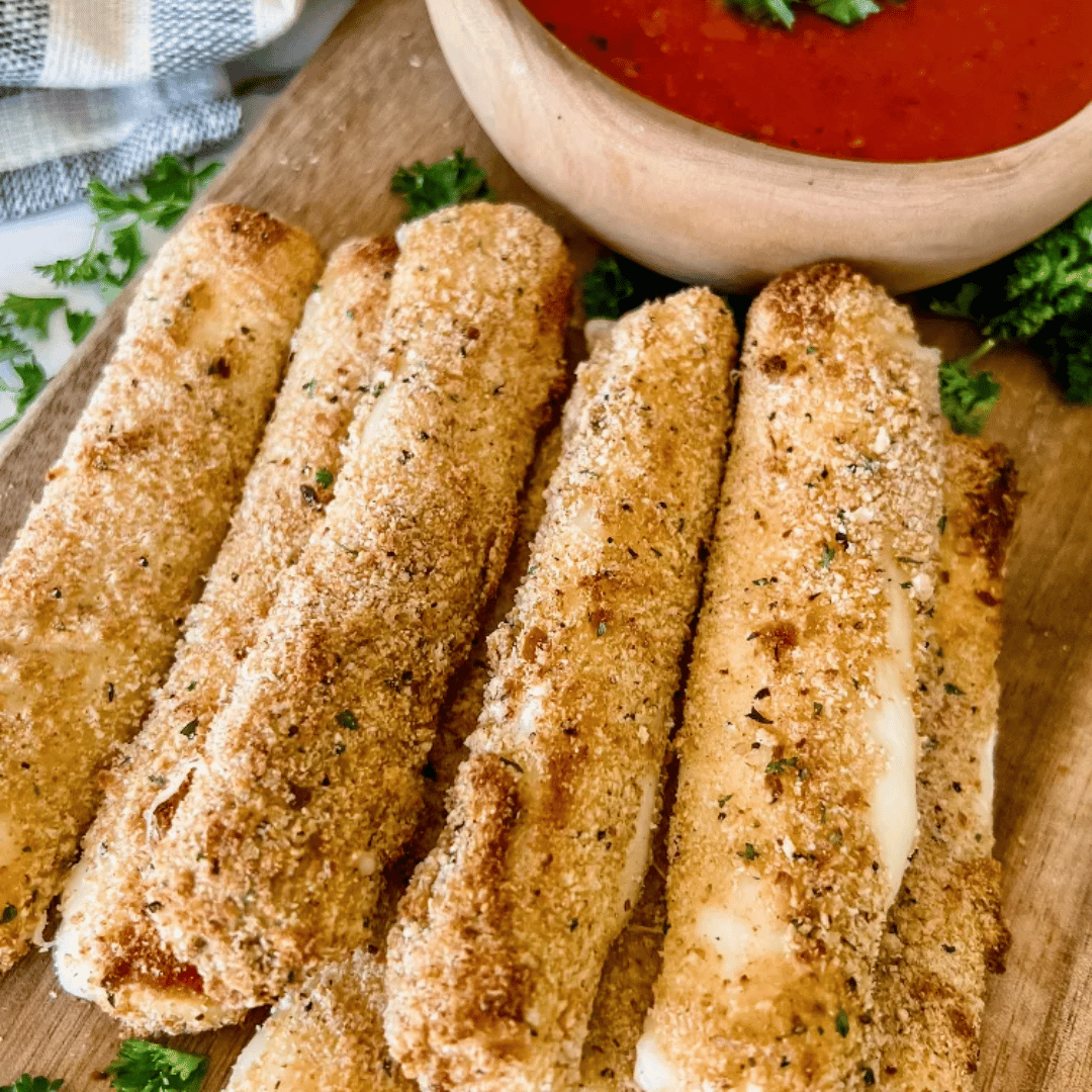 These Easy Healthy Mozzarella Sticks make a delicious game-day snack or appetizer! These are coated in flour, egg wash, bread crumbs, seasonings, and then air fried or baked to golden perfection! Try dipping them in my homemade zero-point marinara sauce!