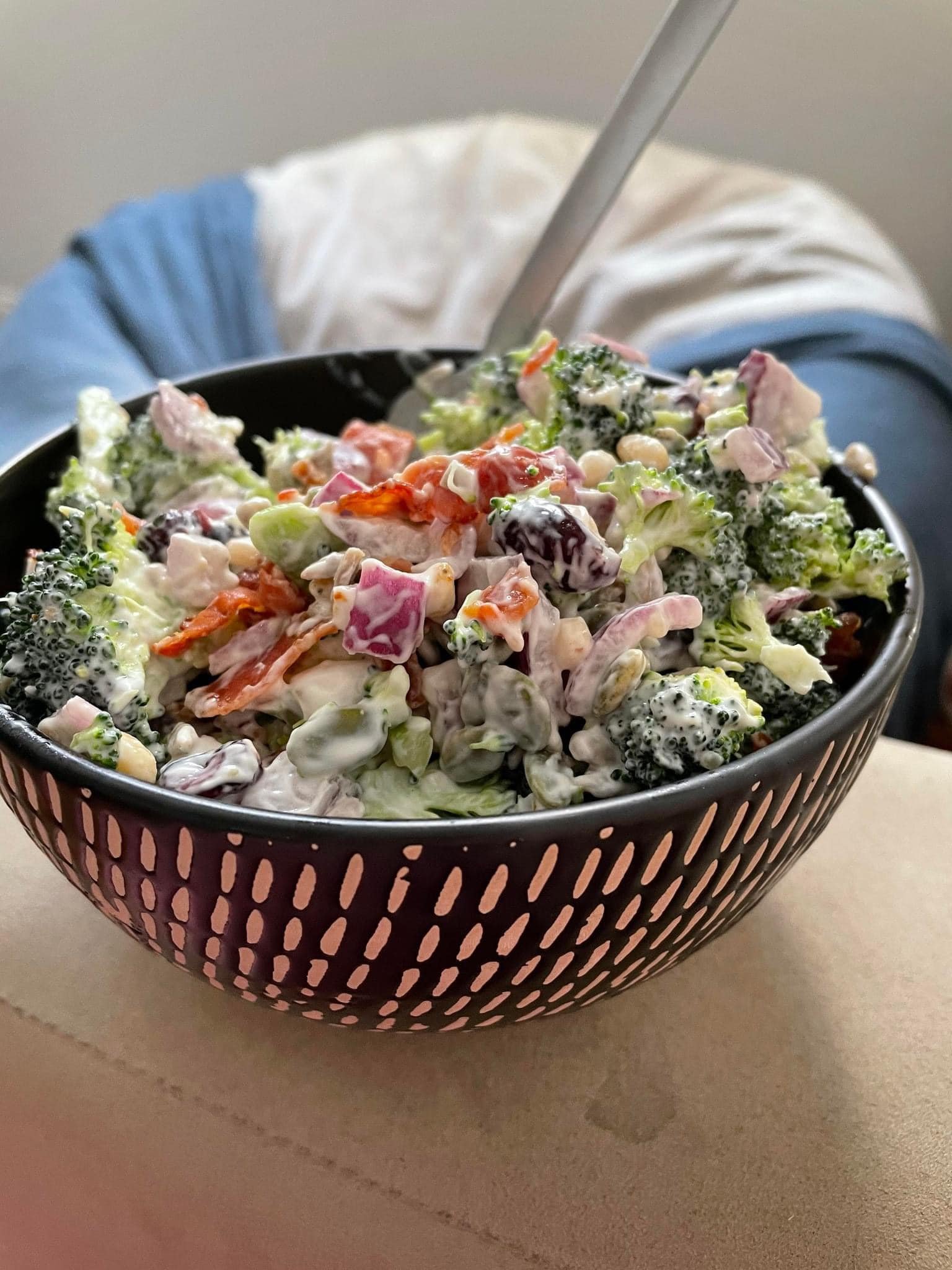 8 cups Uncooked broccoli, chopped (the smaller the better!!) 1⁄2 cup Uncooked red onion, chopped 1⁄2 cup Uncooked bell pepper 8 Tbsp (1/2 cup) Kroger Hickory ksmoke flavor real bacon bits 1⁄2 cup Kroger 50% Less sugar dried cranberries 1⁄4 cup Sunflower seeds 1⁄3 cup Dukes Light mayonnaise 2⁄3 cup Plain fat free Greek yogurt 3 Tbsp Apple cider vinegar 2 Tbsp Lakanto Monkfruit sweetener with erythritol, classic salt and pepper to taste Instructions: Whisk together cider vinegar, sweetener, mayonnaise, Greek yogurt, salt and pepper in a medium bowl. Set aside. In a large bowl, combine broccoli, onion, peppers, cranberries, sunflower seeds, and bacon bits. Pour in the prepared dressing and toss to blend. Before serving refrigerate for at least one hour. This tastes best when it is made a day ahead of time! Notes: Servings: Makes 6 servings