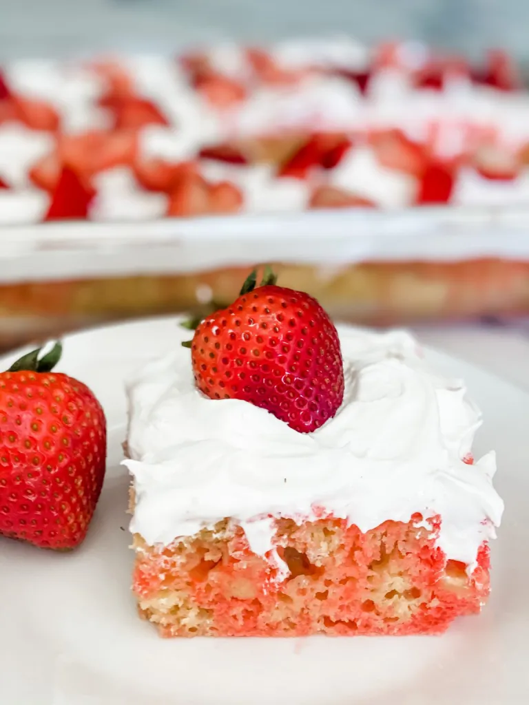 This Easy Lightened Up Strawberry Poke Cake screams summertime-it’s refreshing, fruity, and easy to make!! Perfect for a family gathering, summer BBQ, or weekday dessert!