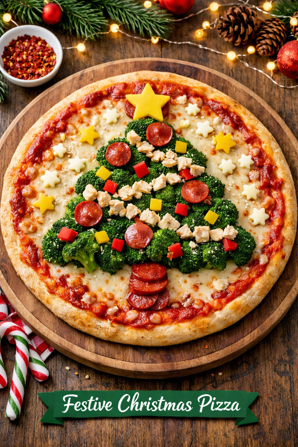 Add pepperoni, bell peppers, and chicken as “ornaments.”