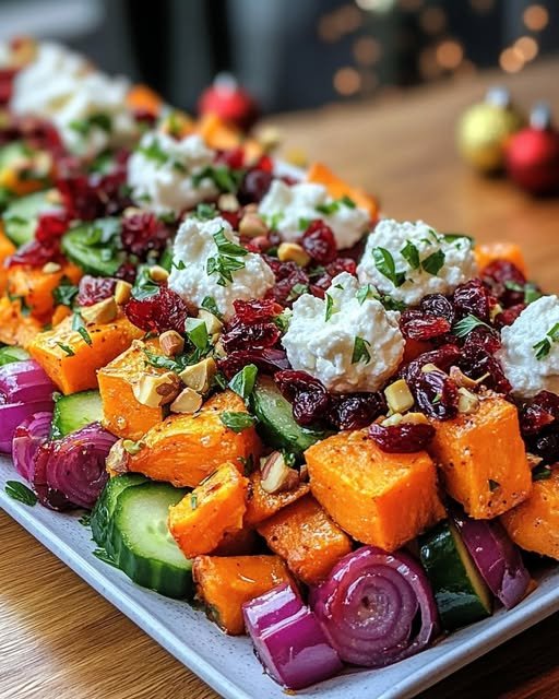 A cozy, holiday-ready bowl with caramelized roasted sweet potatoes, creamy whipped feta, tart cranberries, and crunchy pistachios. Perfect as a Christmas side or a vegetarian main.