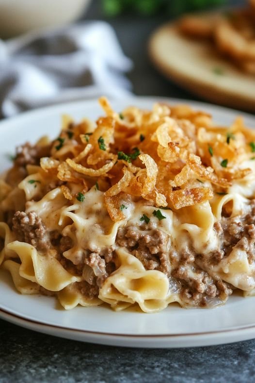 • Combine Ingredients: To the large bowl containing the cooked noodles, add the French onion dip, condensed cream of mushroom soup, and sour cream. Stir these ingredients together until they are well combined. Following this, incorporate the grated cheddar cheese and the cooked ground beef into the mixture.