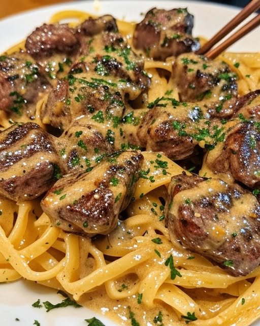 Plate pasta with steak and sauce. Sprinkle with fresh parsley, extra Parmesan, and drizzle with leftover garlic butter for extra richness.