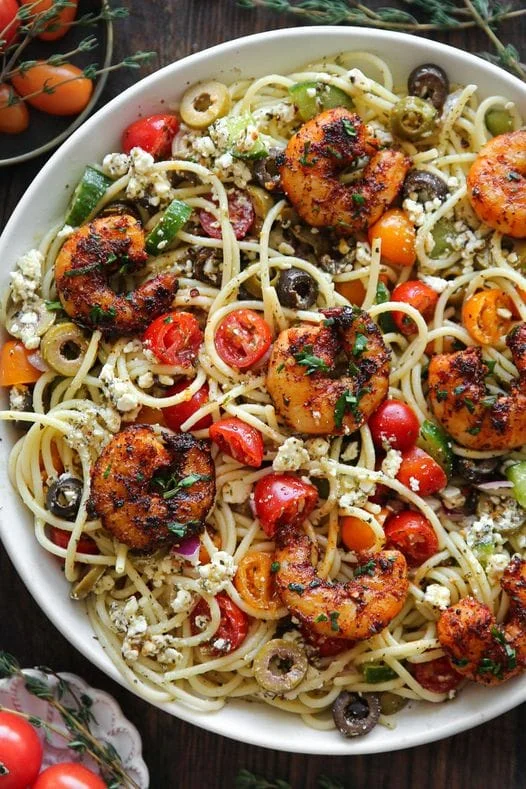 In a large bowl, combine sliced cherry tomatoes, chopped red onion, sliced cucumber, crumbled feta cheese, olives, 1 garlic clove (pressed or finely grated), 2 tablespoons of olive oil, 3 tablespoons of freshly squeezed lemon juice, and Italian seasoning. Add salt and pepper to taste and mix thoroughly. Let the veggies marinate while the pasta is cooking and while you sear the shrimp. The tomatoes should release juices.