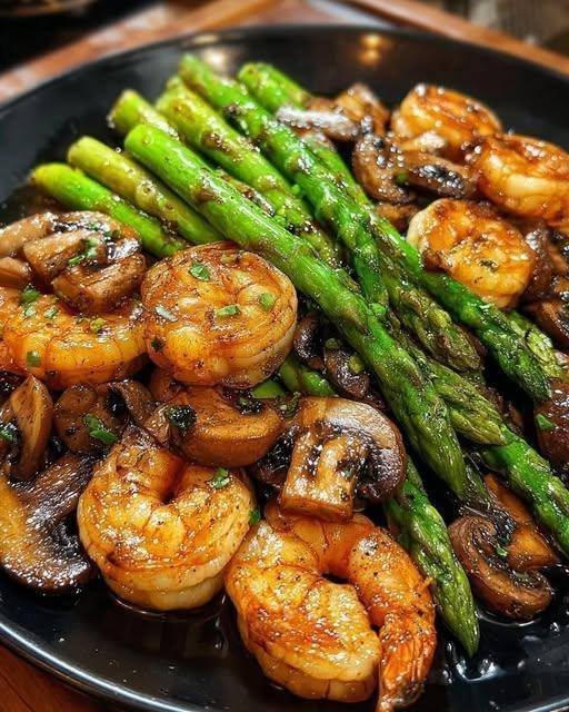 A quick and healthy stir-fry of succulent shrimp, crisp-tender asparagus, and earthy mushrooms, all coated in a garlicky glaze. Perfect as a low-carb dinner or a protein-packed lunch!