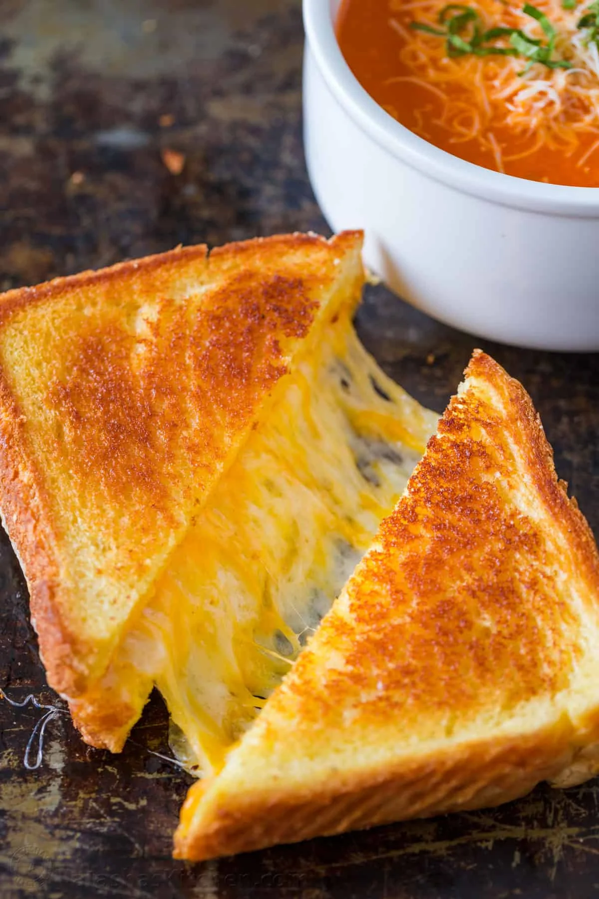 • Continue cooking until the bread is a rich golden brown, flipping once and press down lightly to help the bread stick to the cheese. Total cooking time should one 5-6 minutes. Keep the heat on medium low for the breads to toast slowly, giving your cheese a chance to fully melt and adhere to the bread.
