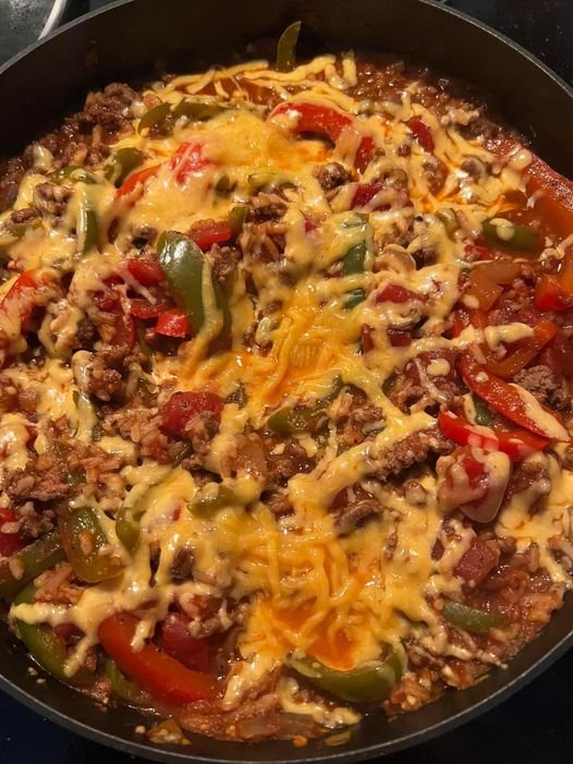 • Brown the ground beef with the onion and garlic in a skillet over medium heat until ground beef is fully cooked, crumbled, and no longer pink. Drain and discard any fat. Place the skillet back on the heat and add in the bell peppers, diced tomatoes, rice, beef broth, tomato paste, Italian seasoning, salt and pepper. Stir to combine and bring mixture to a boil.