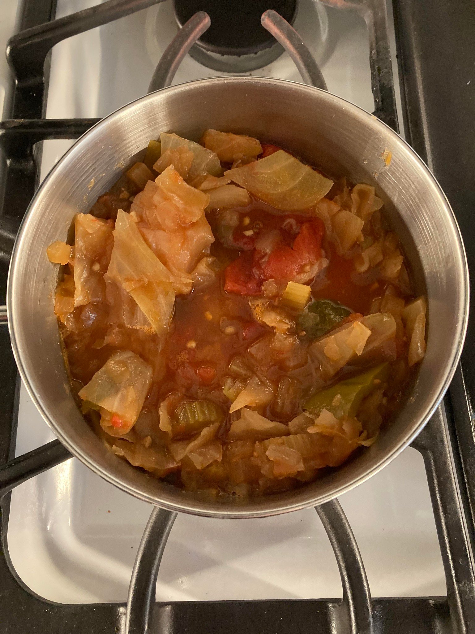 Add broth, Tomato paste, cabbage, green beans, basil, oregano and Salt & Pepper to taste.