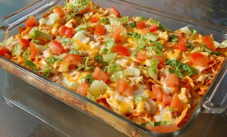 In a 9X13 casserole dish, start with a layer of Doritos. Then layer on the cooked chicken, and cream of chicken soup mix. Sprinkle some cheese on top, and repeat those 4 layers again.