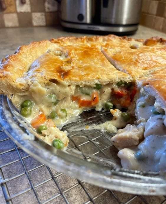 • Transfer chicken mixture to 12-by-8- inch baking dish. Unroll dough and press at perforations to seal seams. Top baking dish with dough, letting edges hang over sides of dish (if needed). Poke a few holes in dough to allow steam to vent. Bake until filling is bubbly and crust is golden, about 20 minutes.