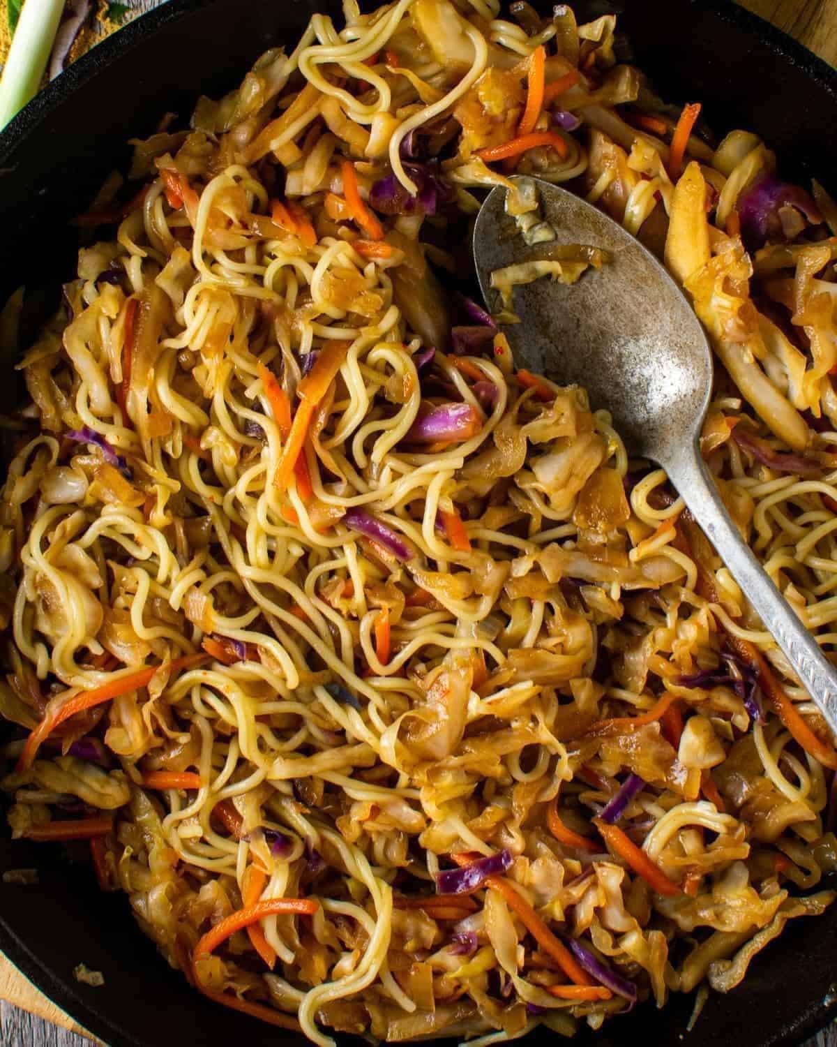 - Add water. Reduce heat to medium and add shredded cabbage, carrots, garlic powder, sesame oil, ginger, and green onions.