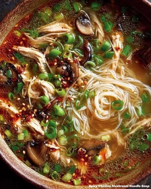 This homemade spicy chicken mushroom noodle soup is a nourishing, high-protein dinner that combines tender shredded chicken, earthy mushrooms, delicate rice noodles, and a rich, aromatic broth infused with chili oil and garlic. It’s perfect for healthy meal prep, cold-weather comfort food, or a restaurant-style Asian cuisine recipe you can make at home.