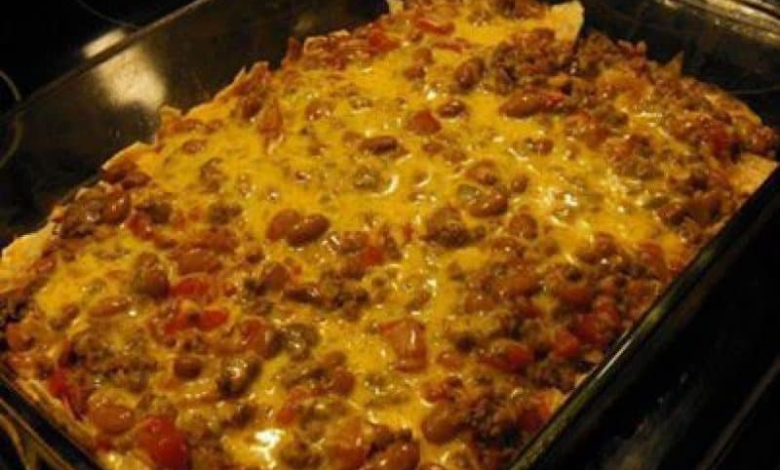 - Spoon half your meat mixture into your casserole dish in an even layer, top with a thin layer of sour cream, then sprinkle with some cheese.