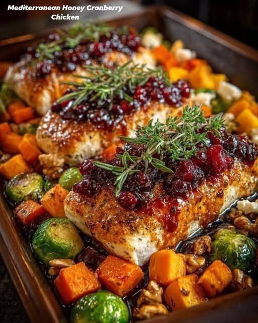 Honey Cranberry Chicken Bake with Caramelized Brussels Sprouts, Sweet Potato & Butternut Squash, Carrot Feta, Walnuts, and Cranberry-Honey Glaze