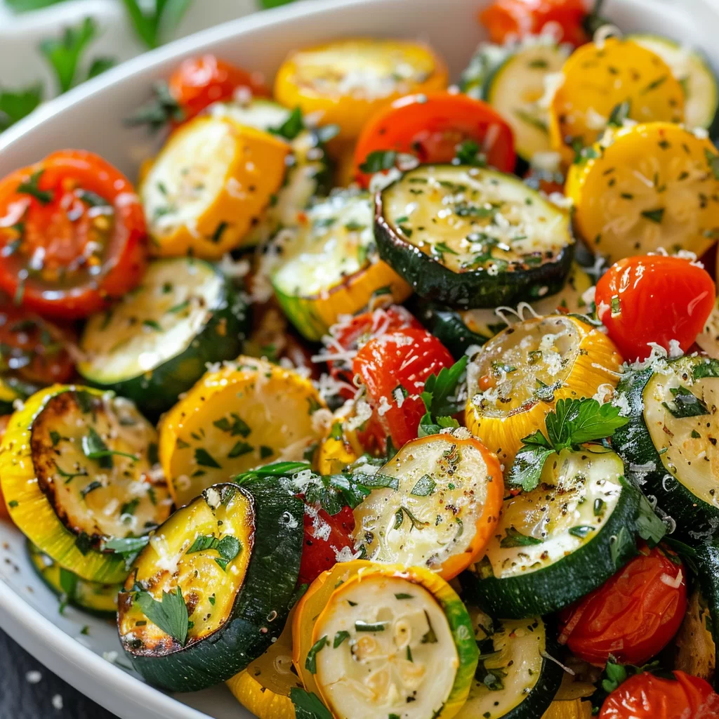 In a large bowl, combine the sliced zucchini, yellow squash, and cherry tomatoes.