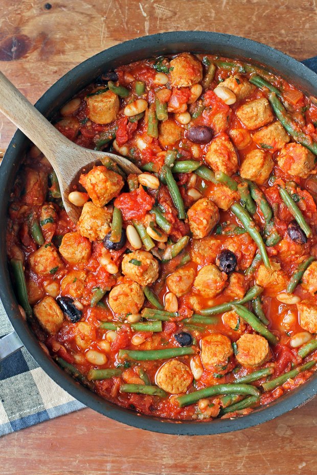 This hearty Italian Sausage and Beans Skillet is a tasty, healthy, one-pot meal! Big chunks of spicy Italian sausage (or sweet or mild if you prefer) with green beans, cannellini beans, onions, garlic, salty olives, and fresh basil all smothered in a sauce of San Marzano tomatoes makes for a satisfying dinner of rustic Italian flavors. This is truly a one-pot meal and needs no accompaniment, but if you’d like to serve something on the side I’d recommend either a side salad with balsamic vinaigrette or a hunk of crusty bread. Either one would be a nice complement! Not only if this dish filling and flavorful, but each 1 ¼ cups serving is just 291 calories or 6 WW Points.