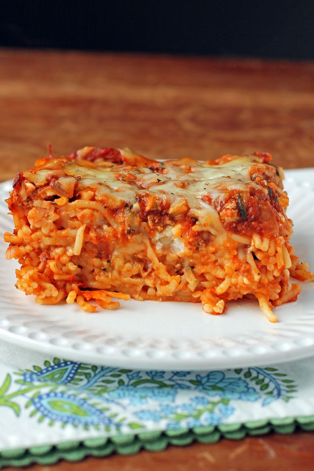 This Loaded Spaghetti Bake is tasty and hearty comfort food, layered like a spaghetti lasagna!